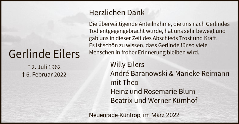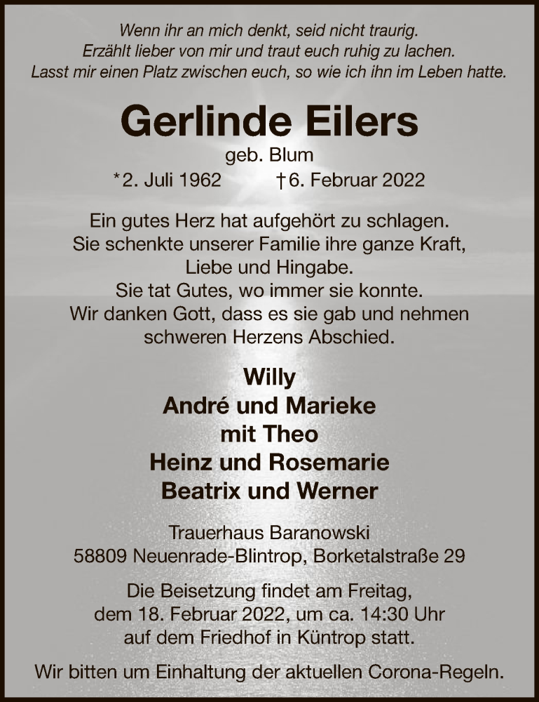 Hier finden Sie alle Traueranzeigen aus der Zeitung, die bisher für Gerlinde Eilers erschienen sind. Weitere Traueranzeigen, die in der Zeitung erscheinen, werden hier ebenfalls aufgelistet