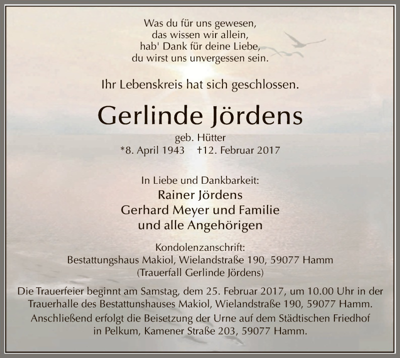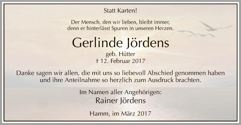 Hier finden Sie alle Traueranzeigen aus der Zeitung, die bisher für Gerlinde Jördens erschienen sind. Weitere Traueranzeigen, die in der Zeitung erscheinen, werden hier ebenfalls aufgelistet