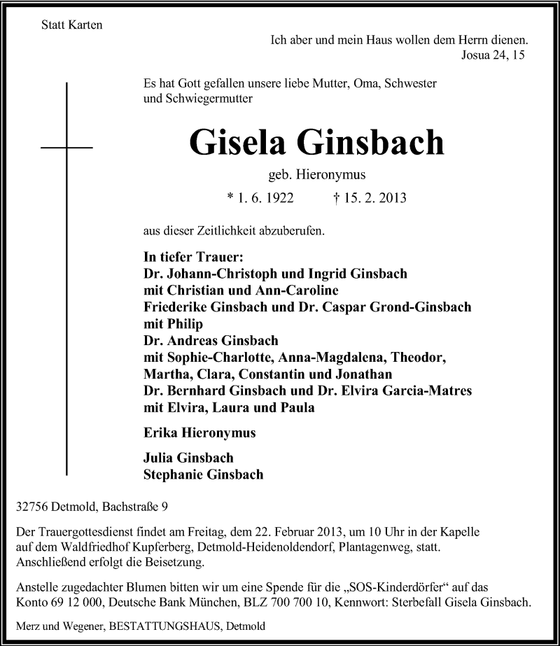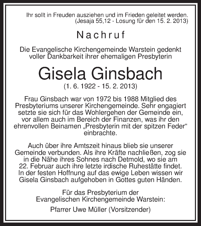 Hier finden Sie alle Traueranzeigen aus der Zeitung, die bisher für Gisela Ginsbach erschienen sind. Weitere Traueranzeigen, die in der Zeitung erscheinen, werden hier ebenfalls aufgelistet