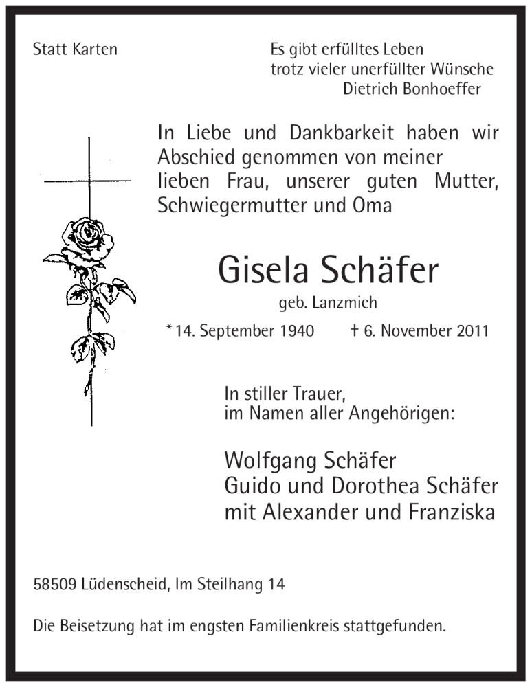 Hier finden Sie alle Traueranzeigen aus der Zeitung, die bisher für Gisela Schäfer erschienen sind. Weitere Traueranzeigen, die in der Zeitung erscheinen, werden hier ebenfalls aufgelistet