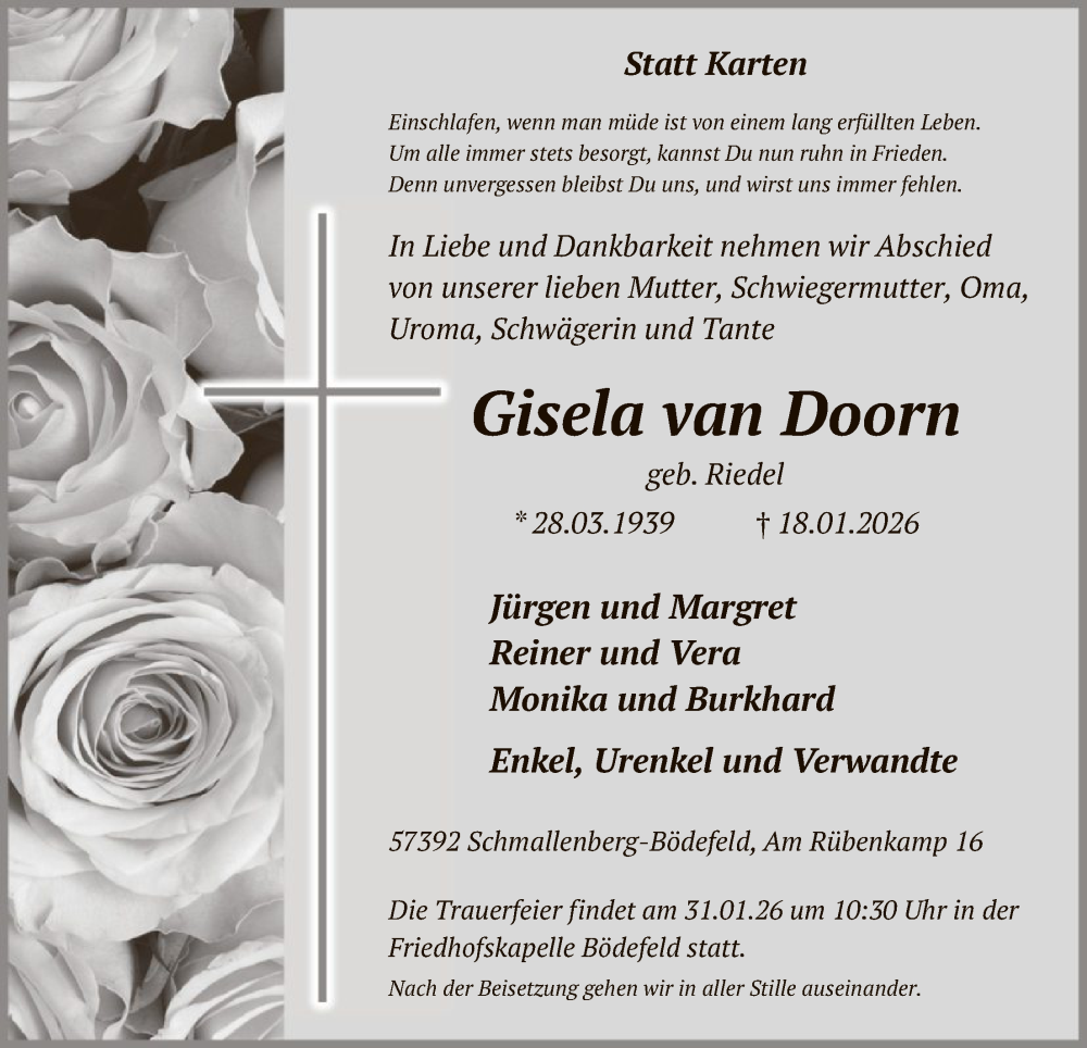 Hier finden Sie alle Traueranzeigen aus der Zeitung, die bisher für Gisela van Doorn erschienen sind. Weitere Traueranzeigen, die in der Zeitung erscheinen, werden hier ebenfalls aufgelistet