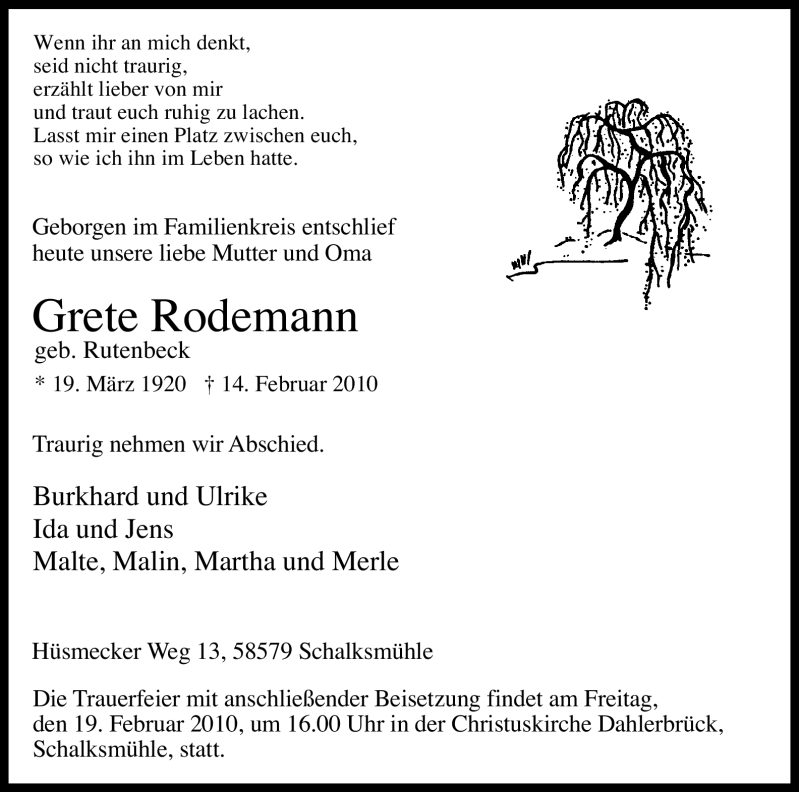 Hier finden Sie alle Traueranzeigen aus der Zeitung, die bisher für Grete Rodemann erschienen sind. Weitere Traueranzeigen, die in der Zeitung erscheinen, werden hier ebenfalls aufgelistet
