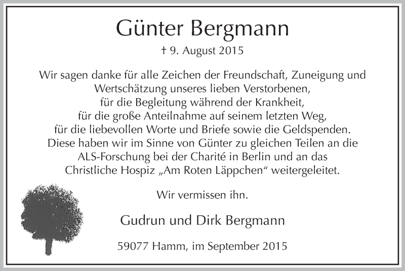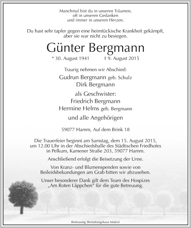 Hier finden Sie alle Traueranzeigen aus der Zeitung, die bisher für Günter Bergmann erschienen sind. Weitere Traueranzeigen, die in der Zeitung erscheinen, werden hier ebenfalls aufgelistet