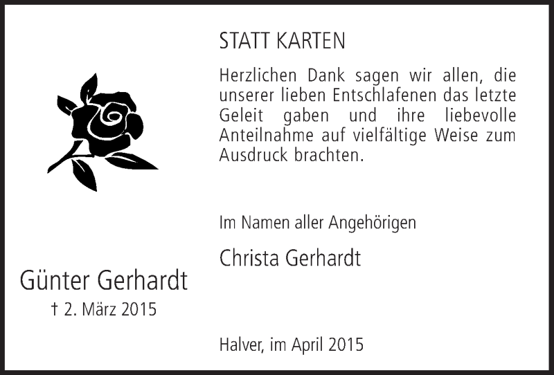 Hier finden Sie alle Traueranzeigen aus der Zeitung, die bisher für Günter Gerhardt erschienen sind. Weitere Traueranzeigen, die in der Zeitung erscheinen, werden hier ebenfalls aufgelistet