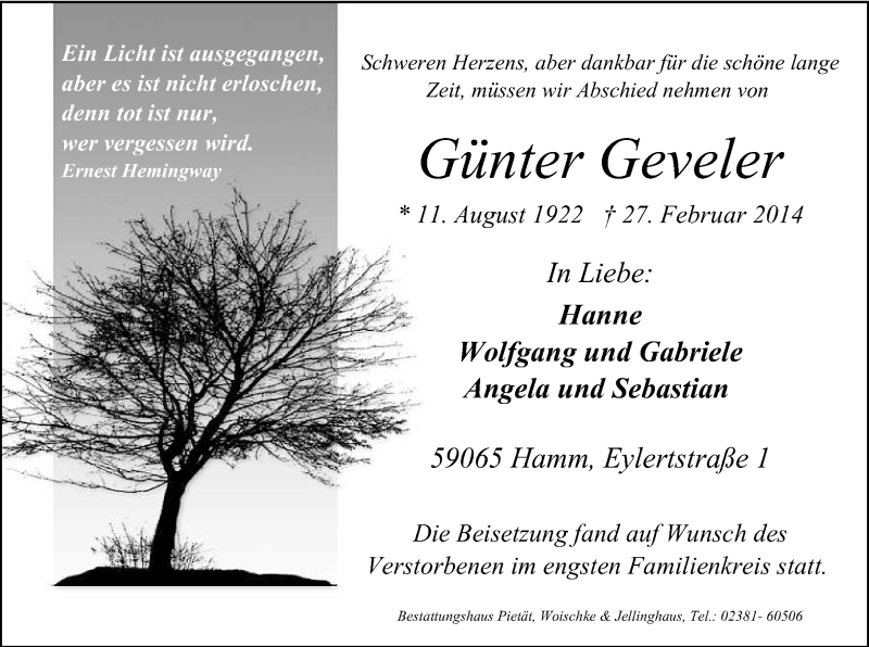 Hier finden Sie alle Traueranzeigen aus der Zeitung, die bisher für Günter Geveler erschienen sind. Weitere Traueranzeigen, die in der Zeitung erscheinen, werden hier ebenfalls aufgelistet