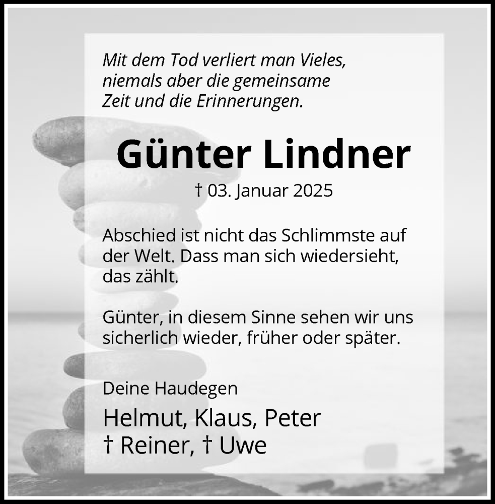 Hier finden Sie alle Traueranzeigen aus der Zeitung, die bisher für Günter Lindner erschienen sind. Weitere Traueranzeigen, die in der Zeitung erscheinen, werden hier ebenfalls aufgelistet