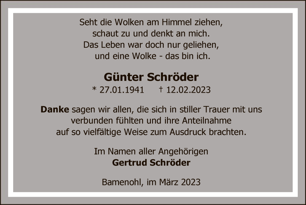 Hier finden Sie alle Traueranzeigen aus der Zeitung, die bisher für Günter Schröder erschienen sind. Weitere Traueranzeigen, die in der Zeitung erscheinen, werden hier ebenfalls aufgelistet