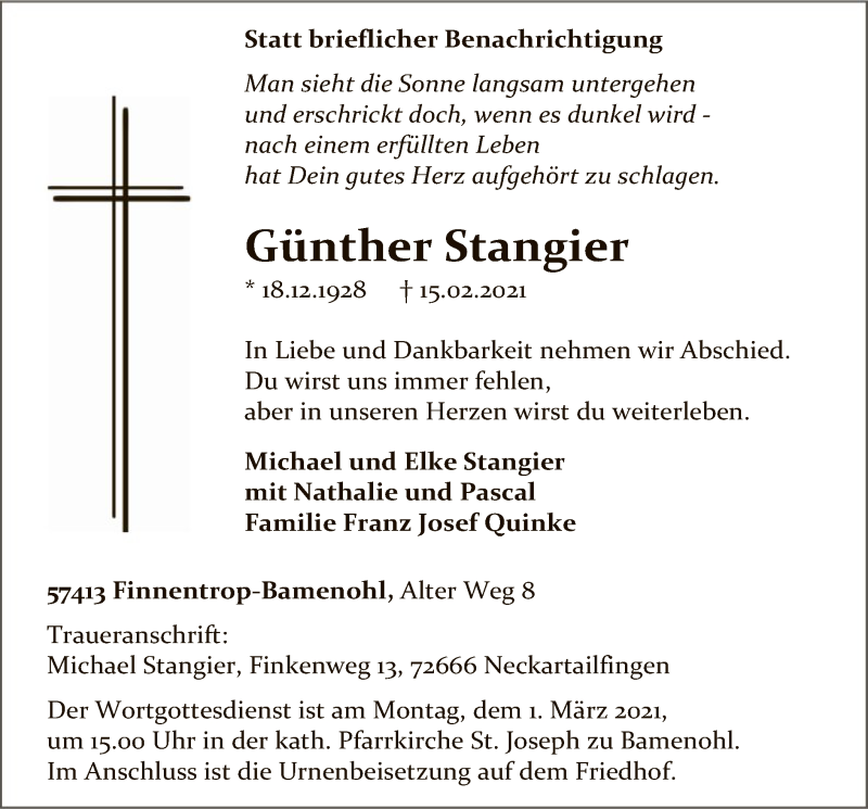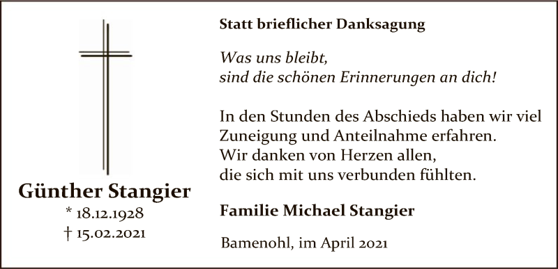 Hier finden Sie alle Traueranzeigen aus der Zeitung, die bisher für Günther Stangier erschienen sind. Weitere Traueranzeigen, die in der Zeitung erscheinen, werden hier ebenfalls aufgelistet