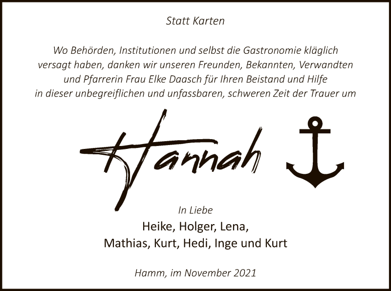 Hier finden Sie alle Traueranzeigen aus der Zeitung, die bisher für Hannah erschienen sind. Weitere Traueranzeigen, die in der Zeitung erscheinen, werden hier ebenfalls aufgelistet