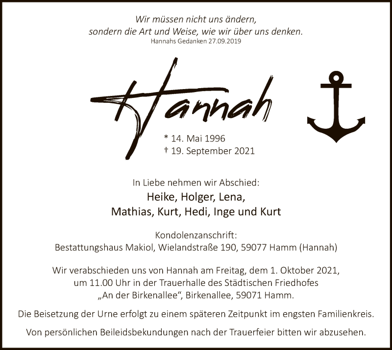 Hier finden Sie alle Traueranzeigen aus der Zeitung, die bisher für Hannah erschienen sind. Weitere Traueranzeigen, die in der Zeitung erscheinen, werden hier ebenfalls aufgelistet