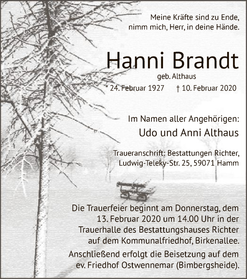 Hier finden Sie alle Traueranzeigen aus der Zeitung, die bisher für Hanni Brandt erschienen sind. Weitere Traueranzeigen, die in der Zeitung erscheinen, werden hier ebenfalls aufgelistet