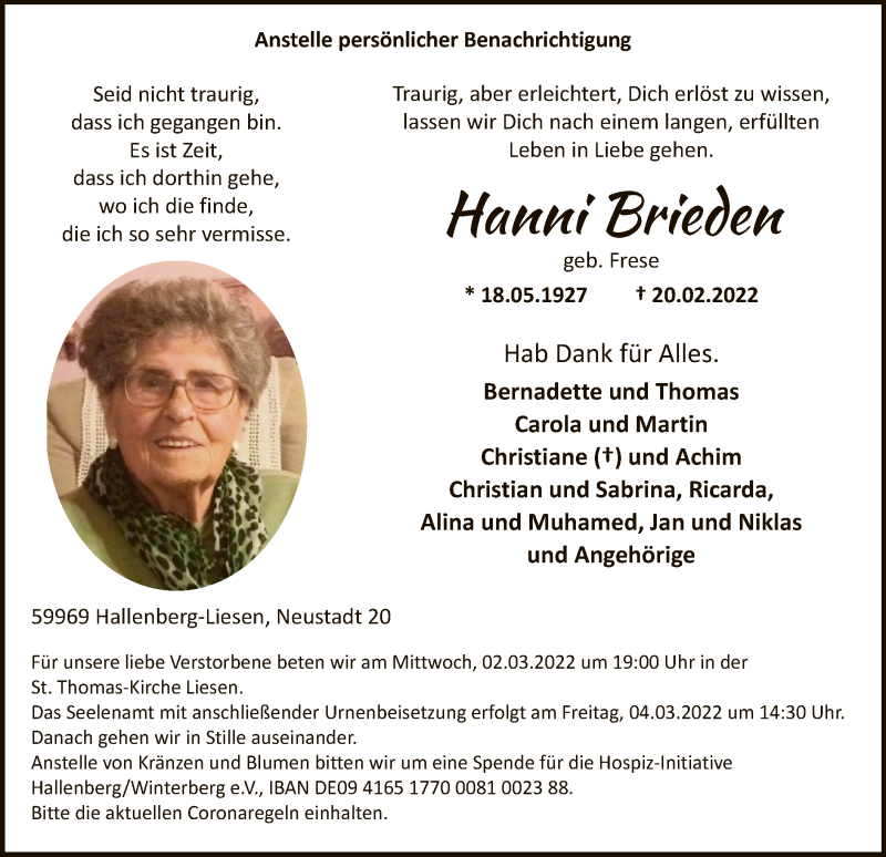 Hier finden Sie alle Traueranzeigen aus der Zeitung, die bisher für Hanni Brieden erschienen sind. Weitere Traueranzeigen, die in der Zeitung erscheinen, werden hier ebenfalls aufgelistet