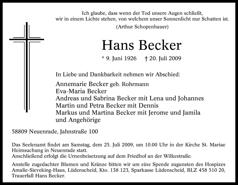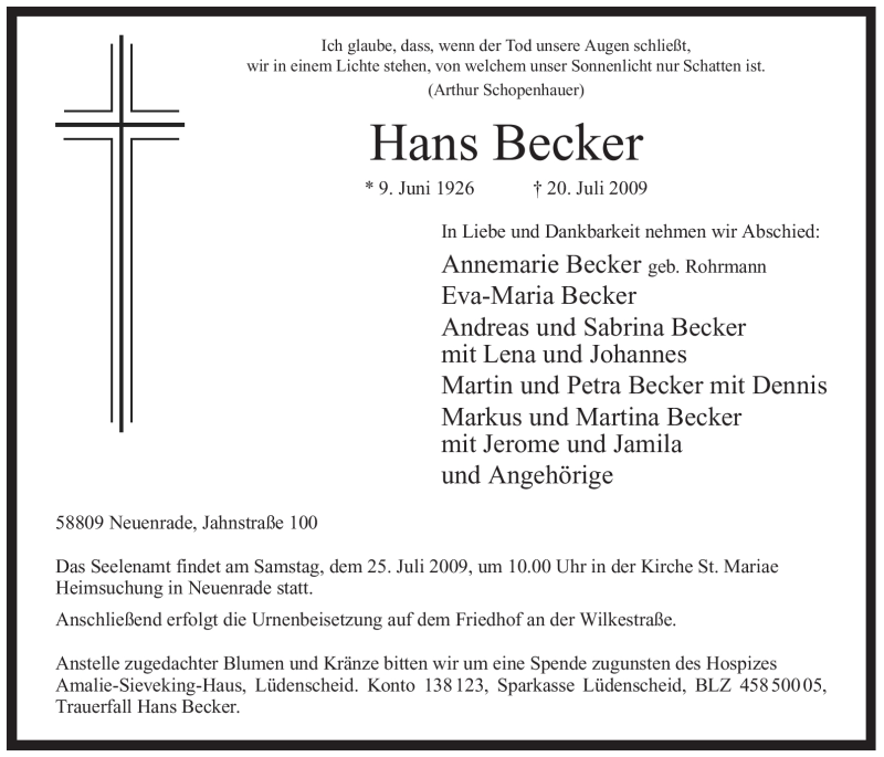 Hier finden Sie alle Traueranzeigen aus der Zeitung, die bisher für Hans Becker erschienen sind. Weitere Traueranzeigen, die in der Zeitung erscheinen, werden hier ebenfalls aufgelistet