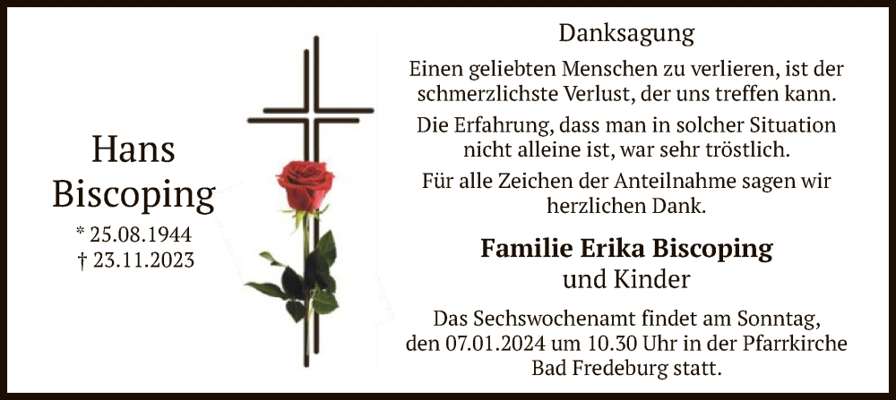 Hier finden Sie alle Traueranzeigen aus der Zeitung, die bisher für Hans Biscoping erschienen sind. Weitere Traueranzeigen, die in der Zeitung erscheinen, werden hier ebenfalls aufgelistet