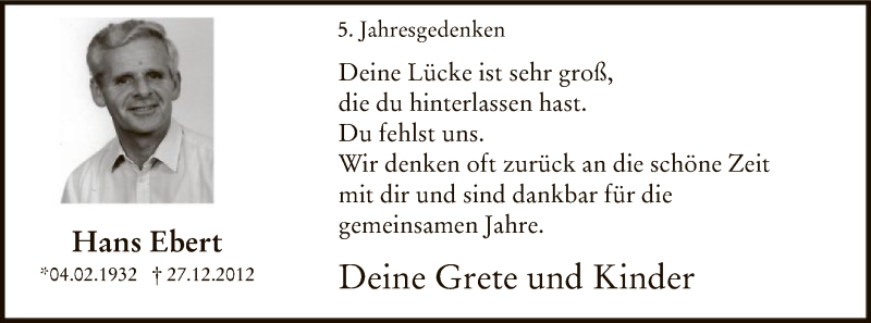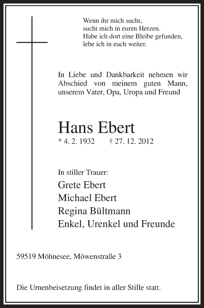Hier finden Sie alle Traueranzeigen aus der Zeitung, die bisher für Hans Ebert erschienen sind. Weitere Traueranzeigen, die in der Zeitung erscheinen, werden hier ebenfalls aufgelistet