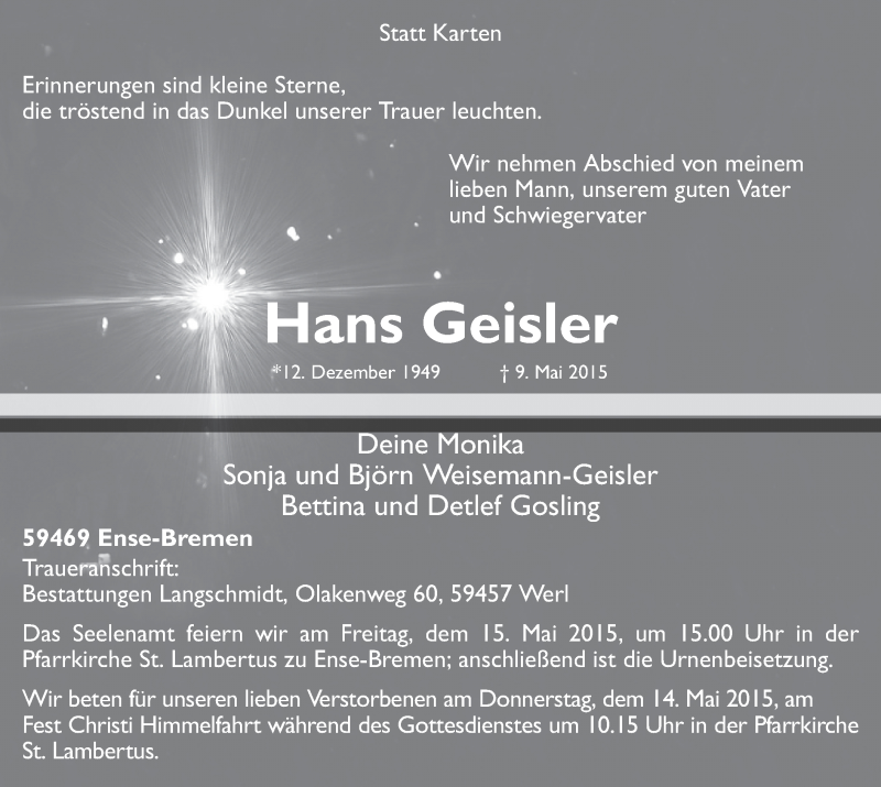 Hier finden Sie alle Traueranzeigen aus der Zeitung, die bisher für Hans Geisler erschienen sind. Weitere Traueranzeigen, die in der Zeitung erscheinen, werden hier ebenfalls aufgelistet