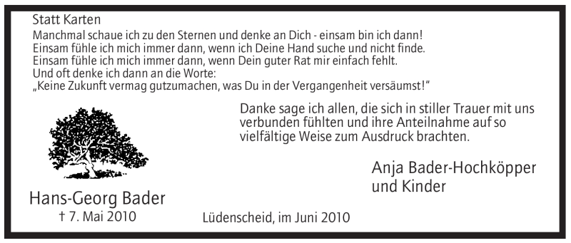 Hier finden Sie alle Traueranzeigen aus der Zeitung, die bisher für Hans-Georg Bader erschienen sind. Weitere Traueranzeigen, die in der Zeitung erscheinen, werden hier ebenfalls aufgelistet