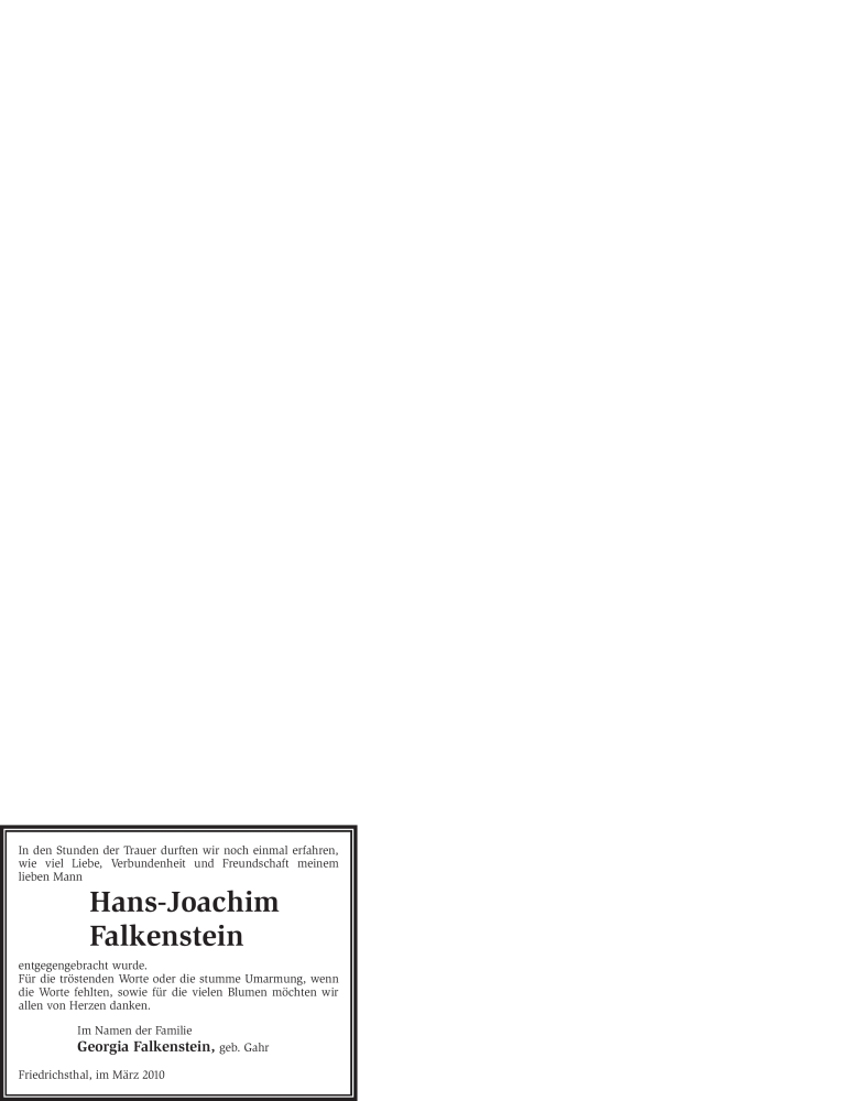 Hier finden Sie alle Traueranzeigen aus der Zeitung, die bisher für Hans-Joachim Falkenstein erschienen sind. Weitere Traueranzeigen, die in der Zeitung erscheinen, werden hier ebenfalls aufgelistet