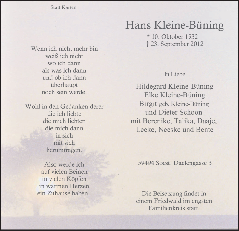 Hier finden Sie alle Traueranzeigen aus der Zeitung, die bisher für Hans Kleine-Büning erschienen sind. Weitere Traueranzeigen, die in der Zeitung erscheinen, werden hier ebenfalls aufgelistet