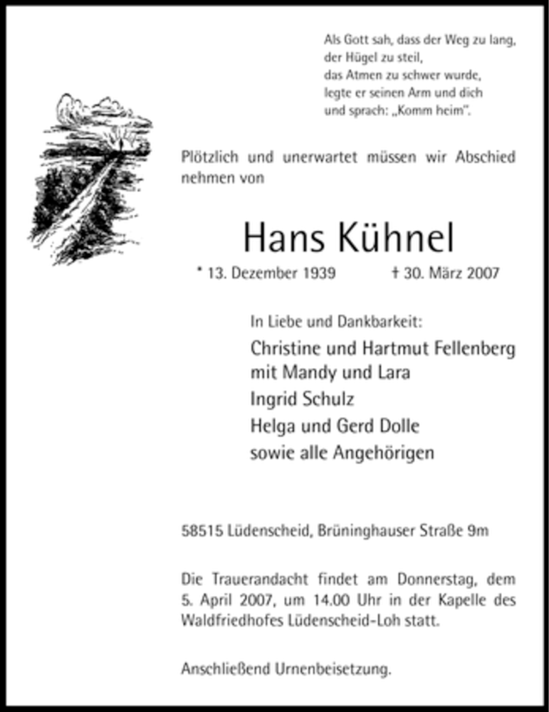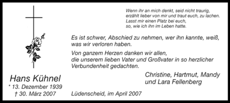 Hier finden Sie alle Traueranzeigen aus der Zeitung, die bisher für Hans Kühnel erschienen sind. Weitere Traueranzeigen, die in der Zeitung erscheinen, werden hier ebenfalls aufgelistet