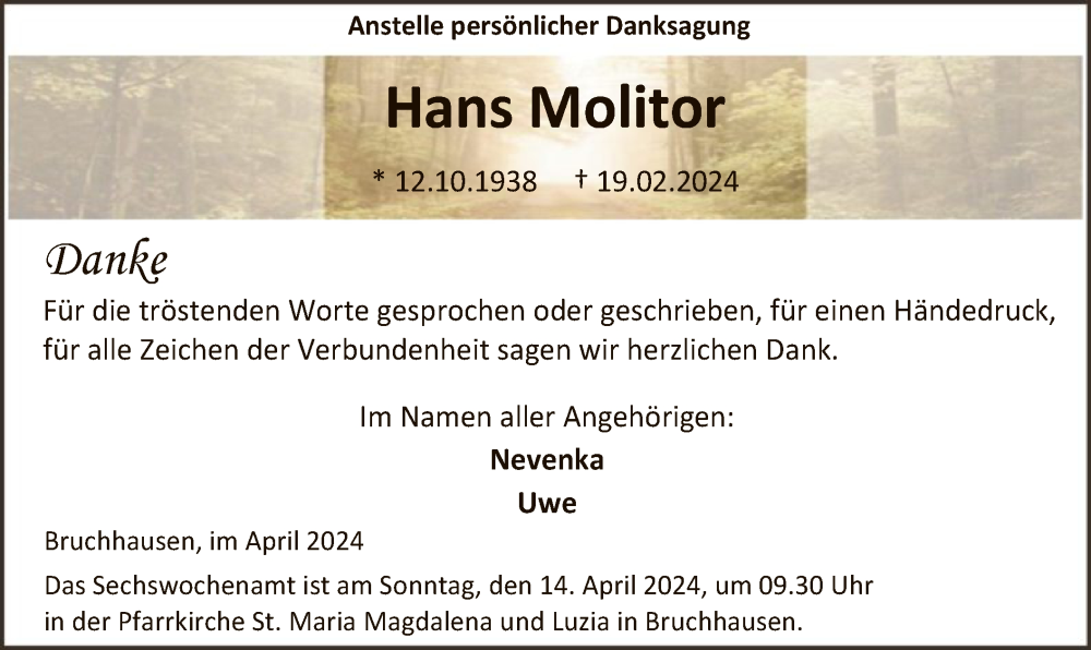 Hier finden Sie alle Traueranzeigen aus der Zeitung, die bisher für Hans Molitor erschienen sind. Weitere Traueranzeigen, die in der Zeitung erscheinen, werden hier ebenfalls aufgelistet