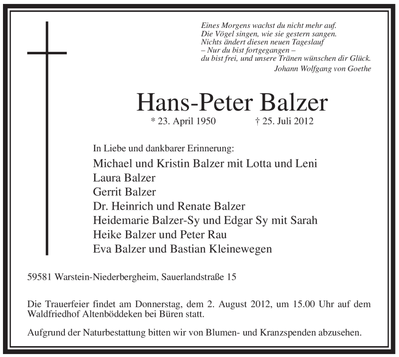 Hier finden Sie alle Traueranzeigen aus der Zeitung, die bisher für Hans-Peter Balzer erschienen sind. Weitere Traueranzeigen, die in der Zeitung erscheinen, werden hier ebenfalls aufgelistet