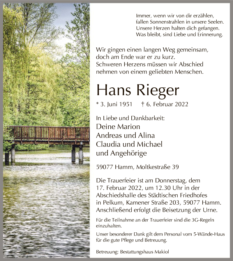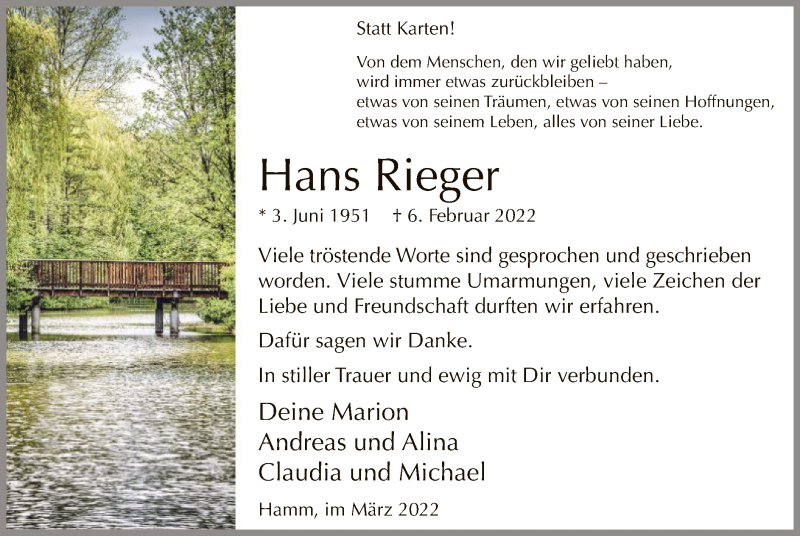Hier finden Sie alle Traueranzeigen aus der Zeitung, die bisher für Hans Rieger erschienen sind. Weitere Traueranzeigen, die in der Zeitung erscheinen, werden hier ebenfalls aufgelistet