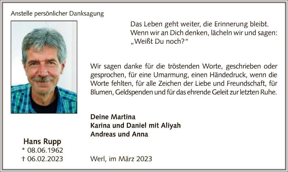 Hier finden Sie alle Traueranzeigen aus der Zeitung, die bisher für Hans Rupp erschienen sind. Weitere Traueranzeigen, die in der Zeitung erscheinen, werden hier ebenfalls aufgelistet