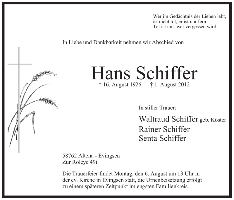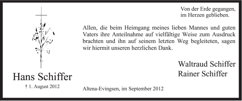 Hier finden Sie alle Traueranzeigen aus der Zeitung, die bisher für Hans Schiffer erschienen sind. Weitere Traueranzeigen, die in der Zeitung erscheinen, werden hier ebenfalls aufgelistet