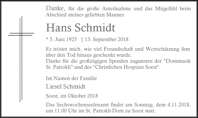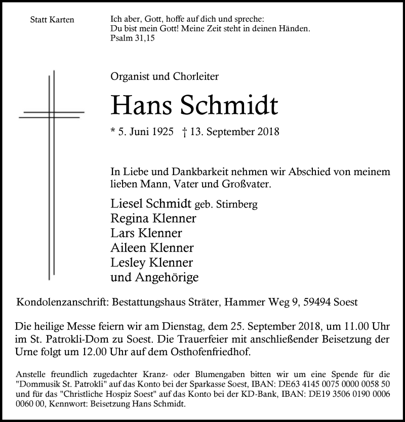 Hier finden Sie alle Traueranzeigen aus der Zeitung, die bisher für Hans Schmidt erschienen sind. Weitere Traueranzeigen, die in der Zeitung erscheinen, werden hier ebenfalls aufgelistet