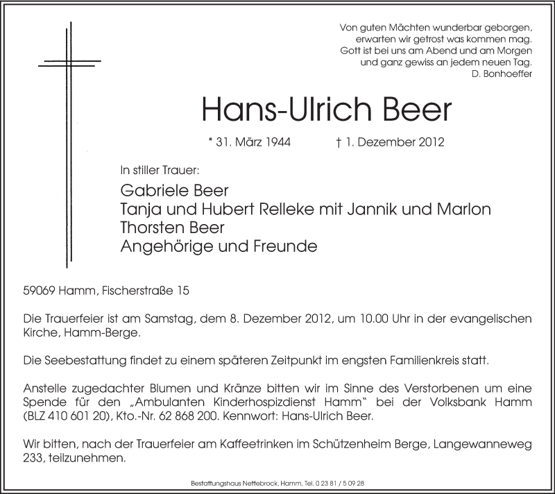 Hier finden Sie alle Traueranzeigen aus der Zeitung, die bisher für Hans-Ulrich Beer erschienen sind. Weitere Traueranzeigen, die in der Zeitung erscheinen, werden hier ebenfalls aufgelistet