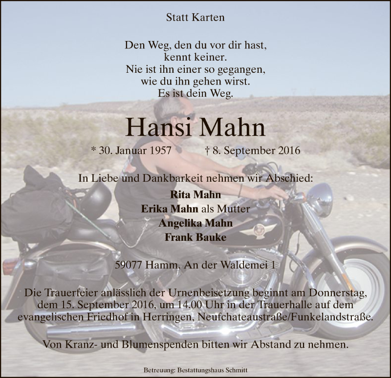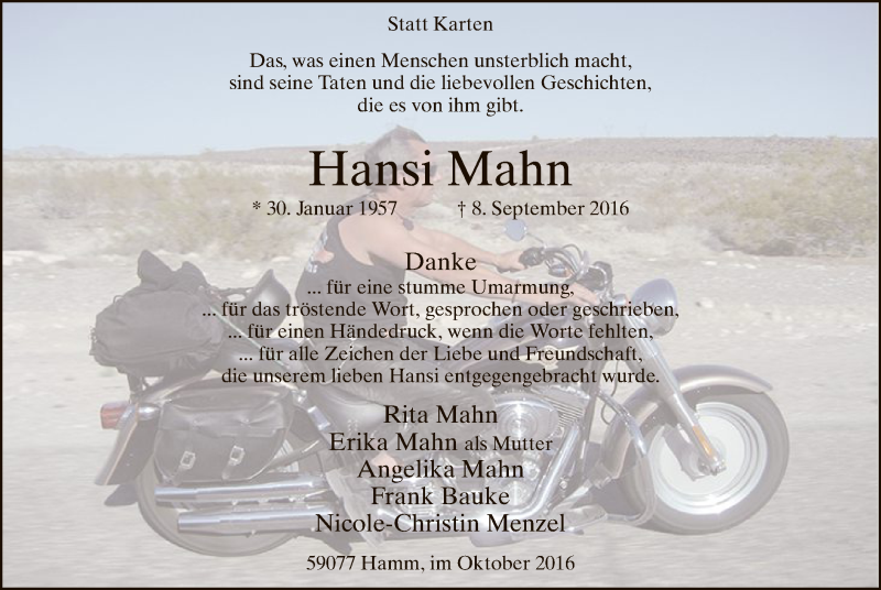 Hier finden Sie alle Traueranzeigen aus der Zeitung, die bisher für Hansi Mahn erschienen sind. Weitere Traueranzeigen, die in der Zeitung erscheinen, werden hier ebenfalls aufgelistet