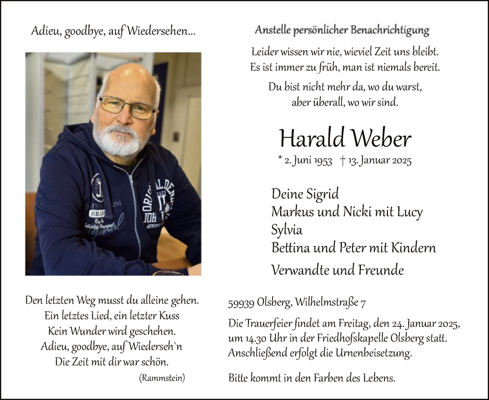 Hier finden Sie alle Traueranzeigen aus der Zeitung, die bisher für Harald Weber erschienen sind. Weitere Traueranzeigen, die in der Zeitung erscheinen, werden hier ebenfalls aufgelistet