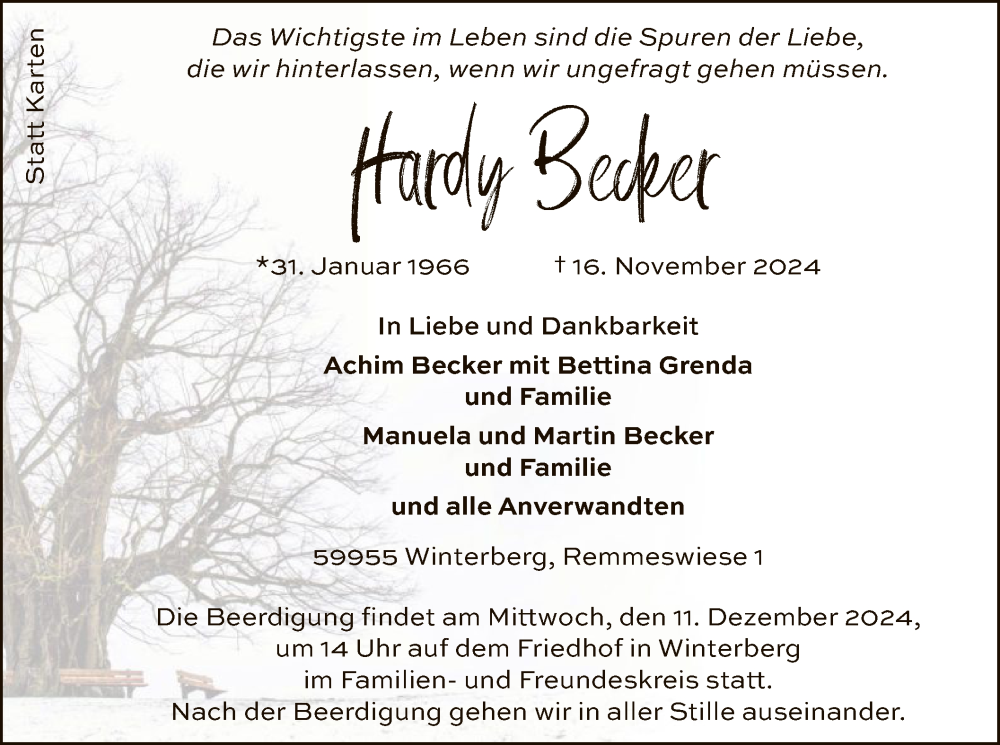 Hier finden Sie alle Traueranzeigen aus der Zeitung, die bisher für Hardy Becker erschienen sind. Weitere Traueranzeigen, die in der Zeitung erscheinen, werden hier ebenfalls aufgelistet