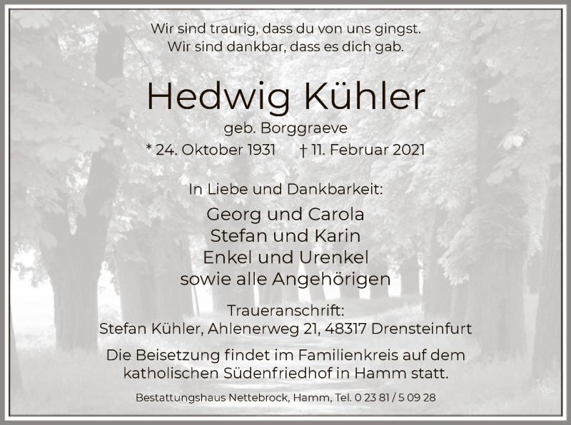 Hier finden Sie alle Traueranzeigen aus der Zeitung, die bisher für Hedwig Kühler erschienen sind. Weitere Traueranzeigen, die in der Zeitung erscheinen, werden hier ebenfalls aufgelistet