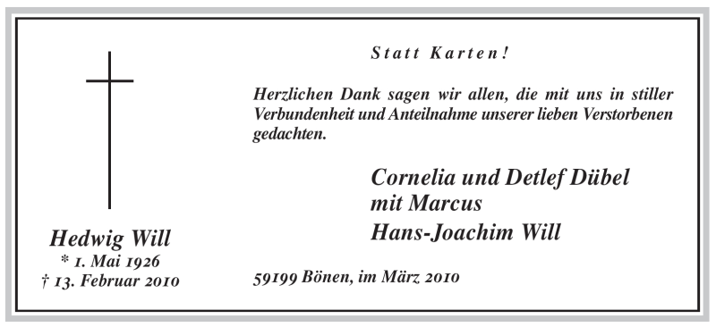 Hier finden Sie alle Traueranzeigen aus der Zeitung, die bisher für Hedwig Will erschienen sind. Weitere Traueranzeigen, die in der Zeitung erscheinen, werden hier ebenfalls aufgelistet