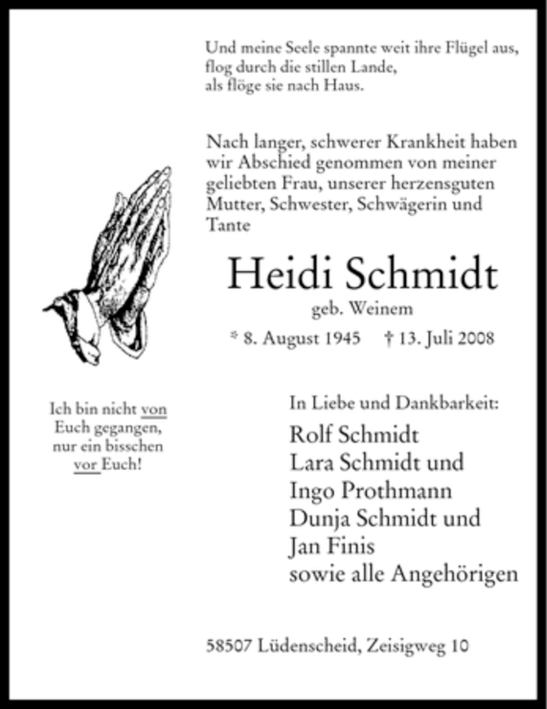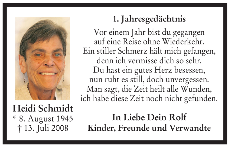 Hier finden Sie alle Traueranzeigen aus der Zeitung, die bisher für Heidi Schmidt erschienen sind. Weitere Traueranzeigen, die in der Zeitung erscheinen, werden hier ebenfalls aufgelistet