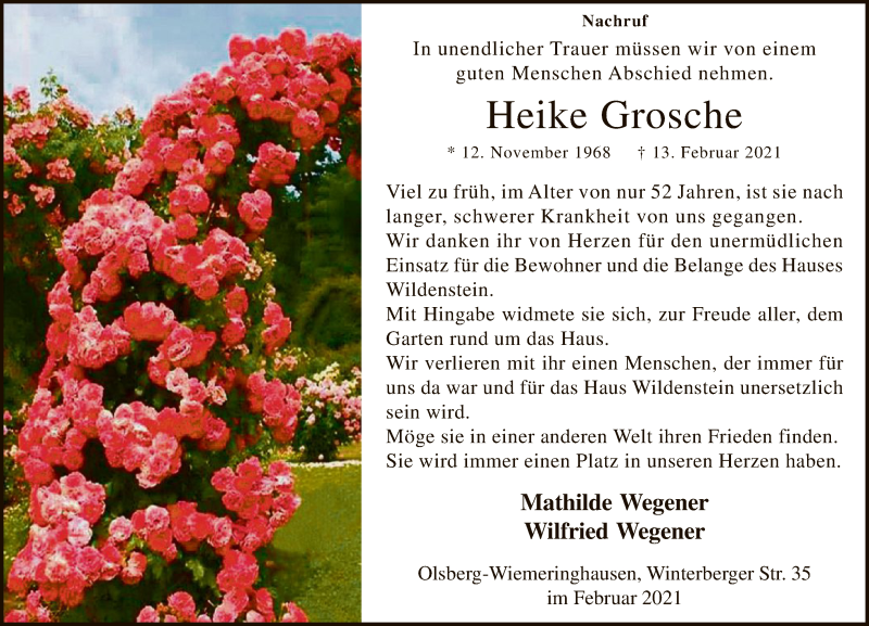 Hier finden Sie alle Traueranzeigen aus der Zeitung, die bisher für Heike Grosche erschienen sind. Weitere Traueranzeigen, die in der Zeitung erscheinen, werden hier ebenfalls aufgelistet