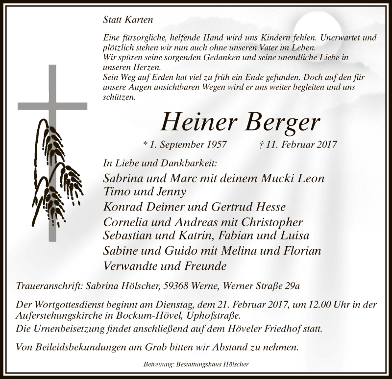 Hier finden Sie alle Traueranzeigen aus der Zeitung, die bisher für Heiner Berger erschienen sind. Weitere Traueranzeigen, die in der Zeitung erscheinen, werden hier ebenfalls aufgelistet