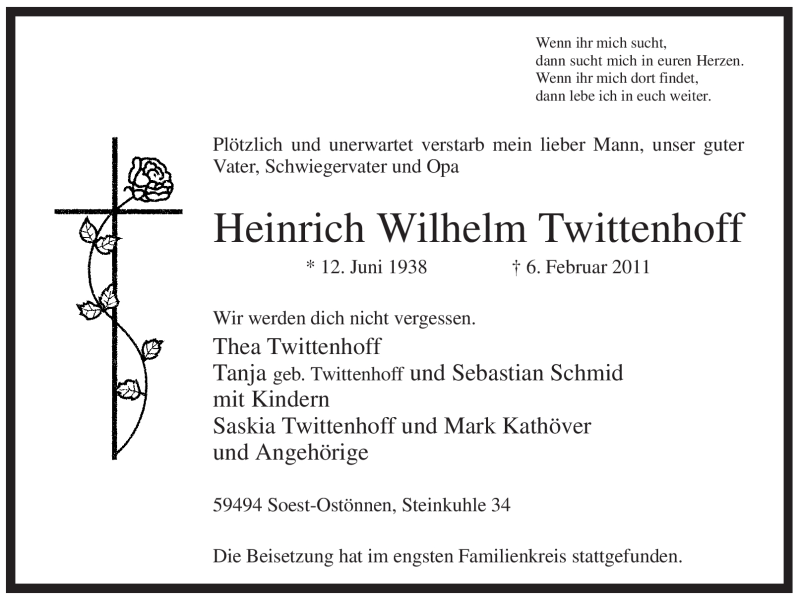 Hier finden Sie alle Traueranzeigen aus der Zeitung, die bisher für Heinrich Wilhelm Twittenhoff erschienen sind. Weitere Traueranzeigen, die in der Zeitung erscheinen, werden hier ebenfalls aufgelistet
