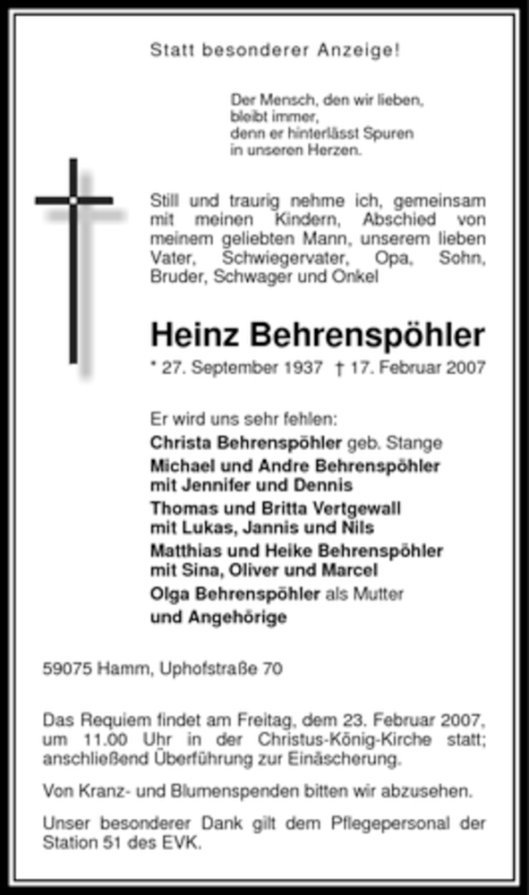 Hier finden Sie alle Traueranzeigen aus der Zeitung, die bisher für Heinz Behrenspöhler erschienen sind. Weitere Traueranzeigen, die in der Zeitung erscheinen, werden hier ebenfalls aufgelistet