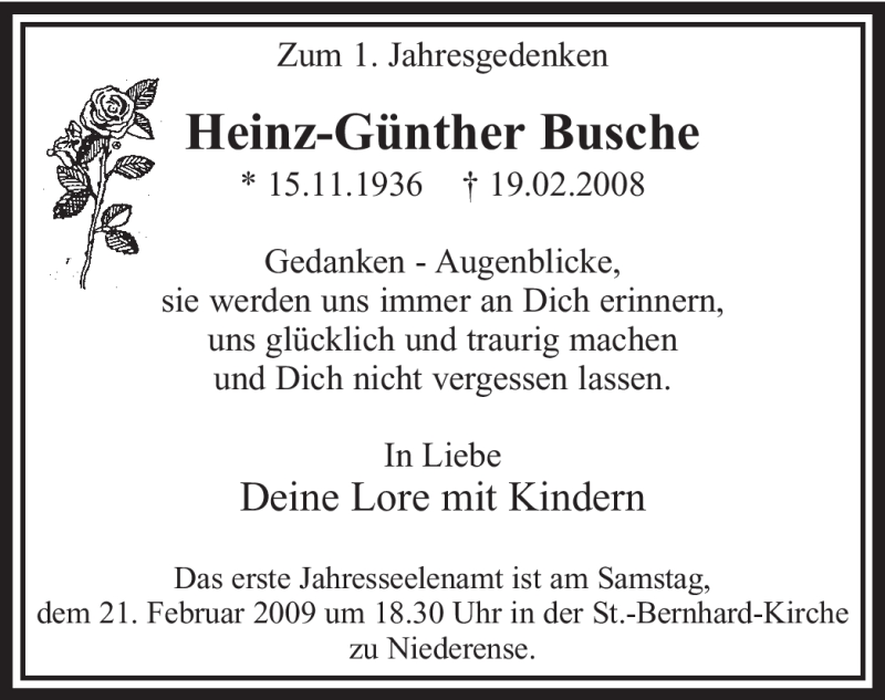 Hier finden Sie alle Traueranzeigen aus der Zeitung, die bisher für Heinz-Günther Busche erschienen sind. Weitere Traueranzeigen, die in der Zeitung erscheinen, werden hier ebenfalls aufgelistet