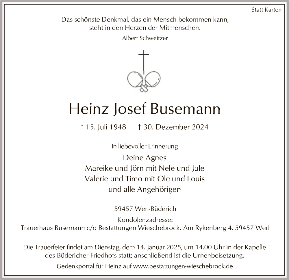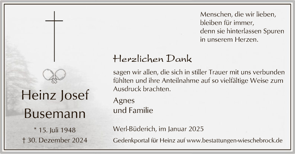 Hier finden Sie alle Traueranzeigen aus der Zeitung, die bisher für Heinz Josef Busemann erschienen sind. Weitere Traueranzeigen, die in der Zeitung erscheinen, werden hier ebenfalls aufgelistet