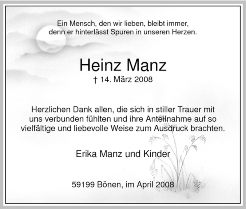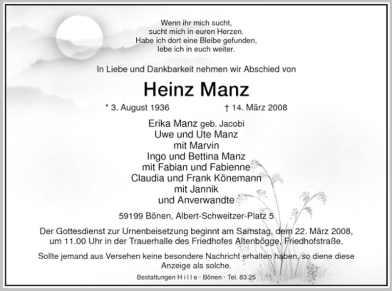 Hier finden Sie alle Traueranzeigen aus der Zeitung, die bisher für Heinz Manz erschienen sind. Weitere Traueranzeigen, die in der Zeitung erscheinen, werden hier ebenfalls aufgelistet