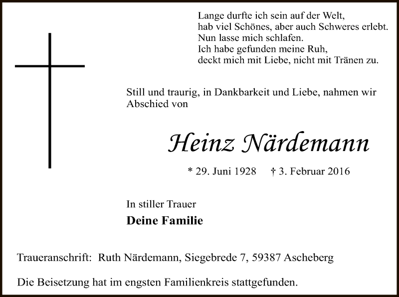 Hier finden Sie alle Traueranzeigen aus der Zeitung, die bisher für Heinz Närdemann erschienen sind. Weitere Traueranzeigen, die in der Zeitung erscheinen, werden hier ebenfalls aufgelistet