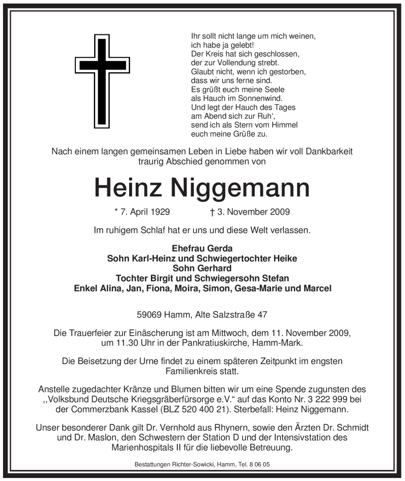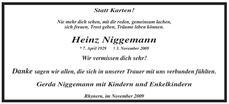 Hier finden Sie alle Traueranzeigen aus der Zeitung, die bisher für Heinz Niggemann erschienen sind. Weitere Traueranzeigen, die in der Zeitung erscheinen, werden hier ebenfalls aufgelistet