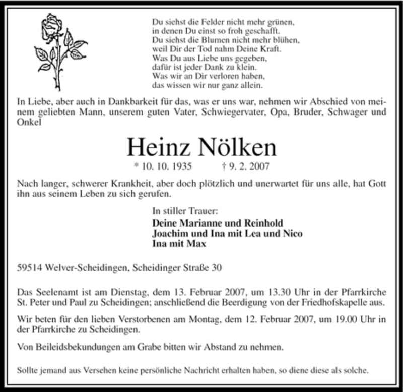 Hier finden Sie alle Traueranzeigen aus der Zeitung, die bisher für Heinz Nölken erschienen sind. Weitere Traueranzeigen, die in der Zeitung erscheinen, werden hier ebenfalls aufgelistet