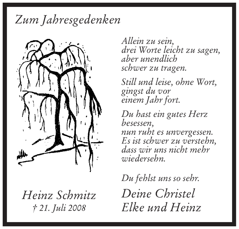 Hier finden Sie alle Traueranzeigen aus der Zeitung, die bisher für Heinz Schmitz erschienen sind. Weitere Traueranzeigen, die in der Zeitung erscheinen, werden hier ebenfalls aufgelistet