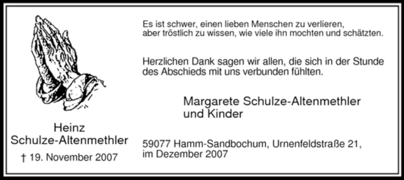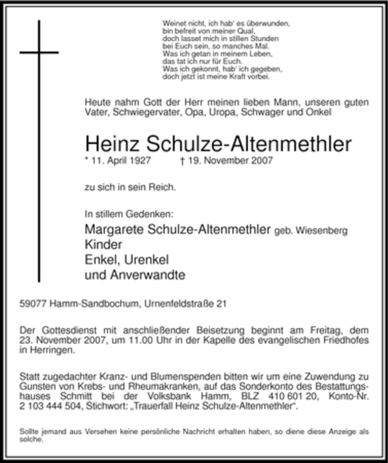 Hier finden Sie alle Traueranzeigen aus der Zeitung, die bisher für Heinz Schulze-Altenmethler erschienen sind. Weitere Traueranzeigen, die in der Zeitung erscheinen, werden hier ebenfalls aufgelistet