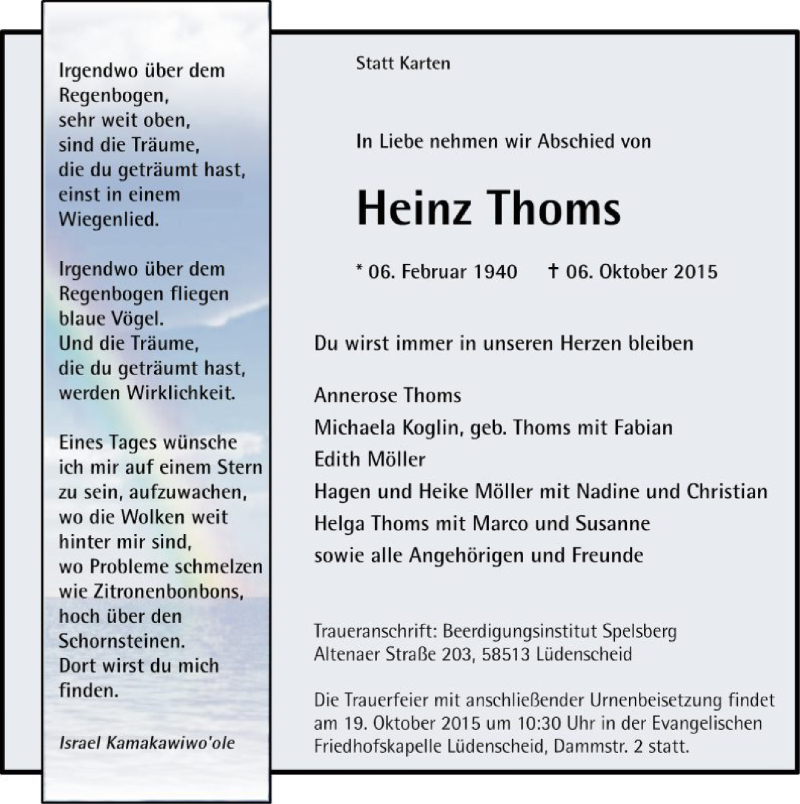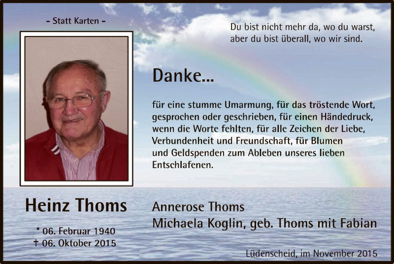 Hier finden Sie alle Traueranzeigen aus der Zeitung, die bisher für Heinz Thoms erschienen sind. Weitere Traueranzeigen, die in der Zeitung erscheinen, werden hier ebenfalls aufgelistet